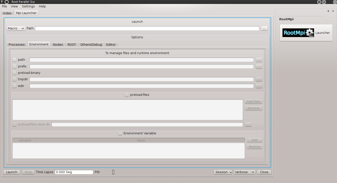The function of this module is to launch OpenMpi/RootMpi processes in a comfortable graphical interface with either ROOT's macros or binary code.It contains all mpirun(command) options and if the code is a macro then ROOT's interpreter options.
