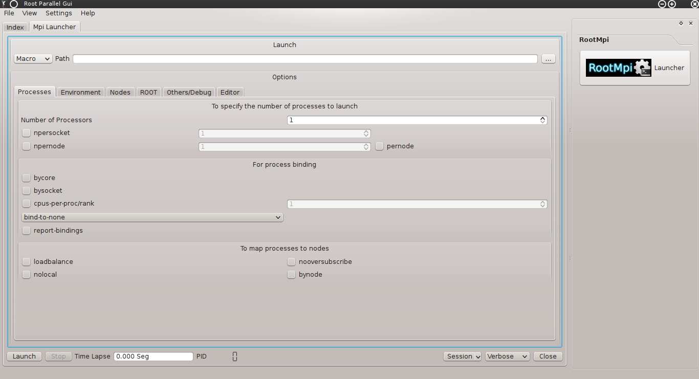 The function of this module is to launch OpenMpi/RootMpi processes in a comfortable graphical interface with either ROOT's macros or binary code.